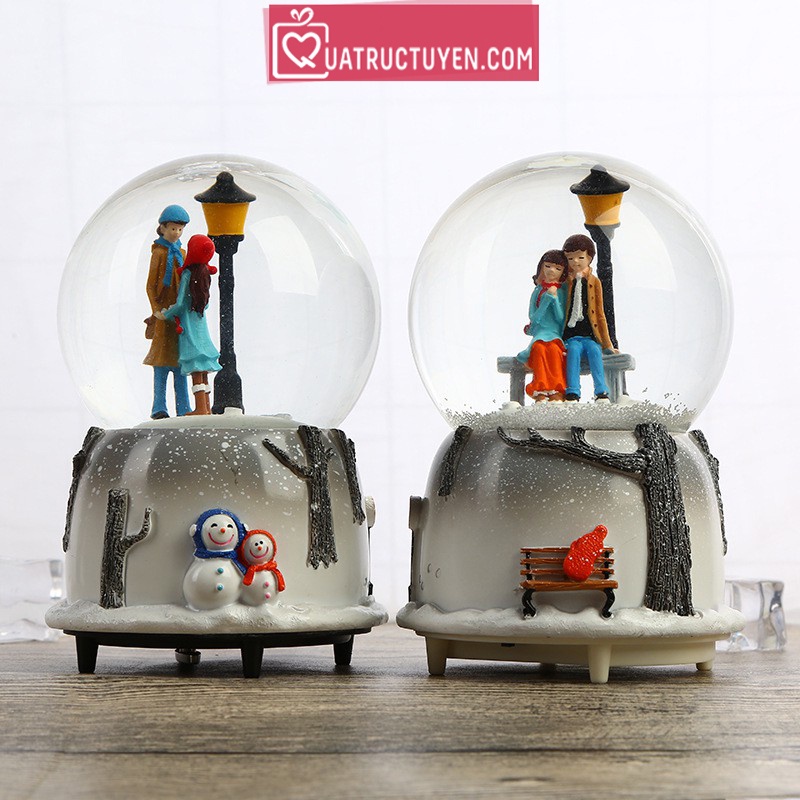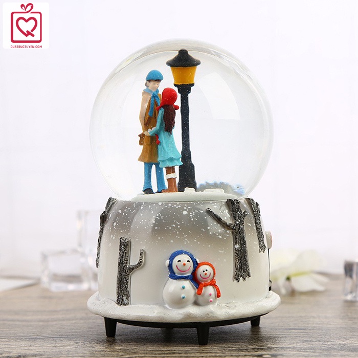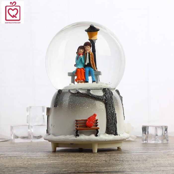 - Phía trên quả cầu là khung cảnh đôi tình nhân tay trong tay, kề bên nhau dưới ánh đèn điện. Khi bạn bật công tắc ở dưới để của hộp nhạc, những bản nhạc sẽ vang lên du dương nhẹ nhàng kèm theo đó là bầu trời tuyết rơi tuyệt đẹp.