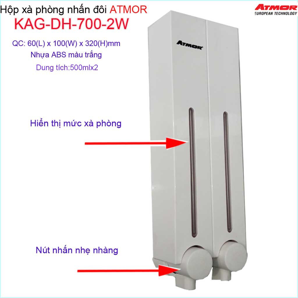 Hộp nhấn xà phòng Atmor KAG-DH7002W-white trắng, bình xịt xà bông 500ml x2 thiết kế sang trọng nhấn êm siêu bềnHộp nhấn xà phòng, Bình xịt xà phòng KAG-DH700.2W ( hay còn gọi là hộp xà phòng nhấn tay, hộp xà phòng treo tường, hộp đựng xà bông nước ...)
