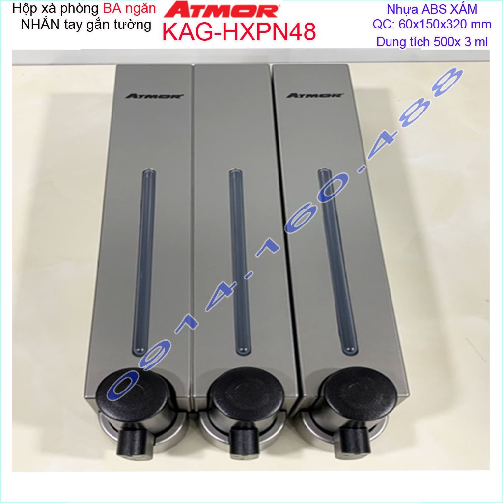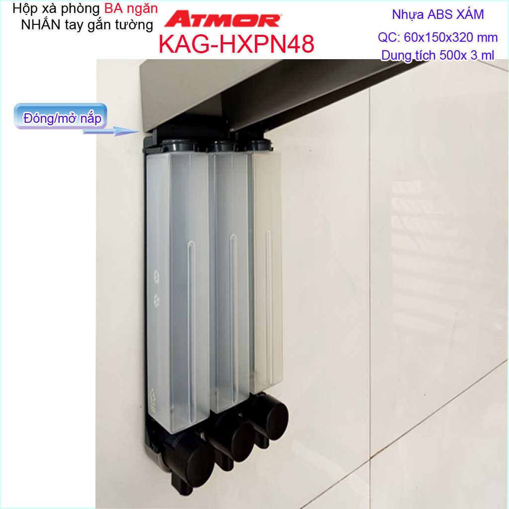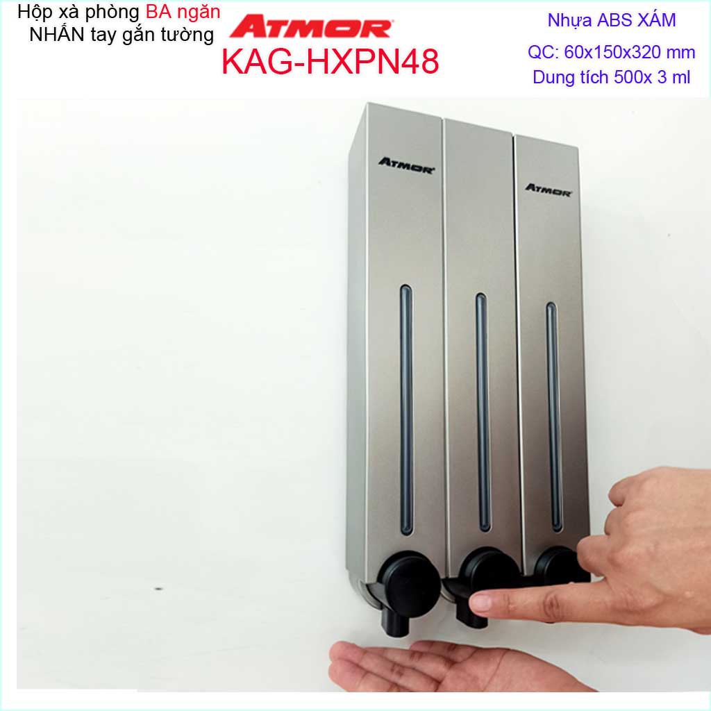 Hộp nhấn xà phòng Atmor KAG-HXPN48-grey xám, bình xịt xà bông 500ml x3 thiết kế sang trọng nhấn êm siêu bềnKích thước 60mmx150mmx320mm ( dung tích 500ml x 3)