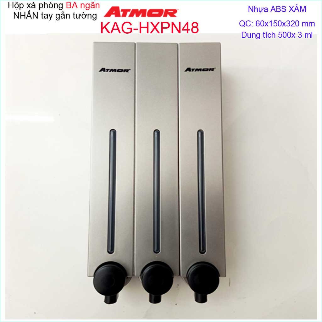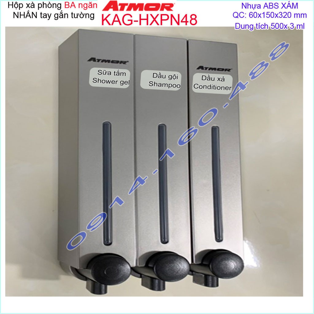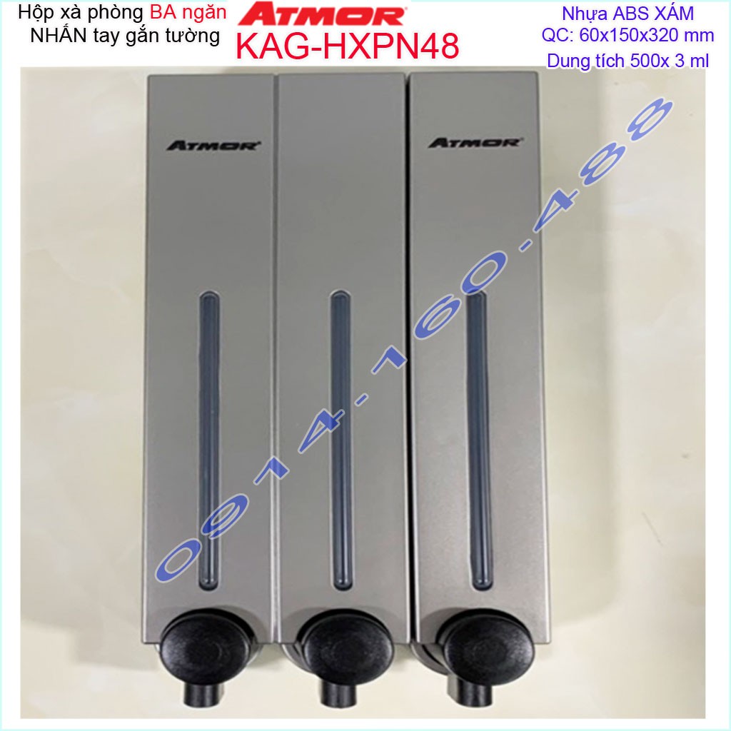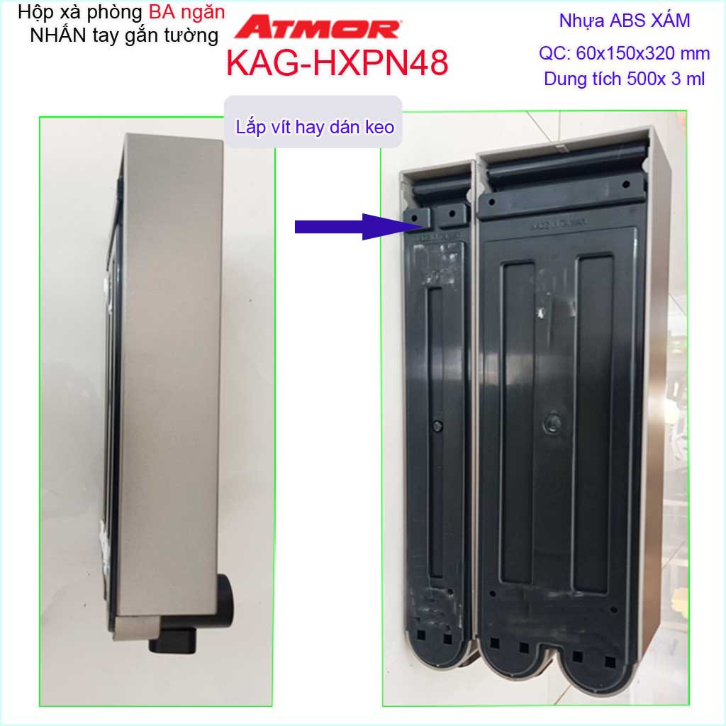 Hộp nhấn xà phòng Atmor KAG-HXPN48-grey xám, bình xịt xà bông 500ml x3 thiết kế sang trọng nhấn êm siêu bềnKích thước 60mmx150mmx320mm ( dung tích 500ml x 3)