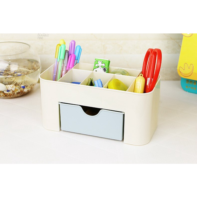 - Hộp nhựa đựng đồ trang điểm để bàn siêu tiện dụng được chia thành 6 ngăn và 1 ngăn kéo vô cùng tiện dụng. Với 6 ngăn được thiết kế lợi dụng khoảng không gian trống phía trên bạn có thể thoải mái đựng các đồ trang điểm, chai lọ hay bút kẻ mắt, nước hoa có độ dài cao mà không có vấn đề trở ngại nào.