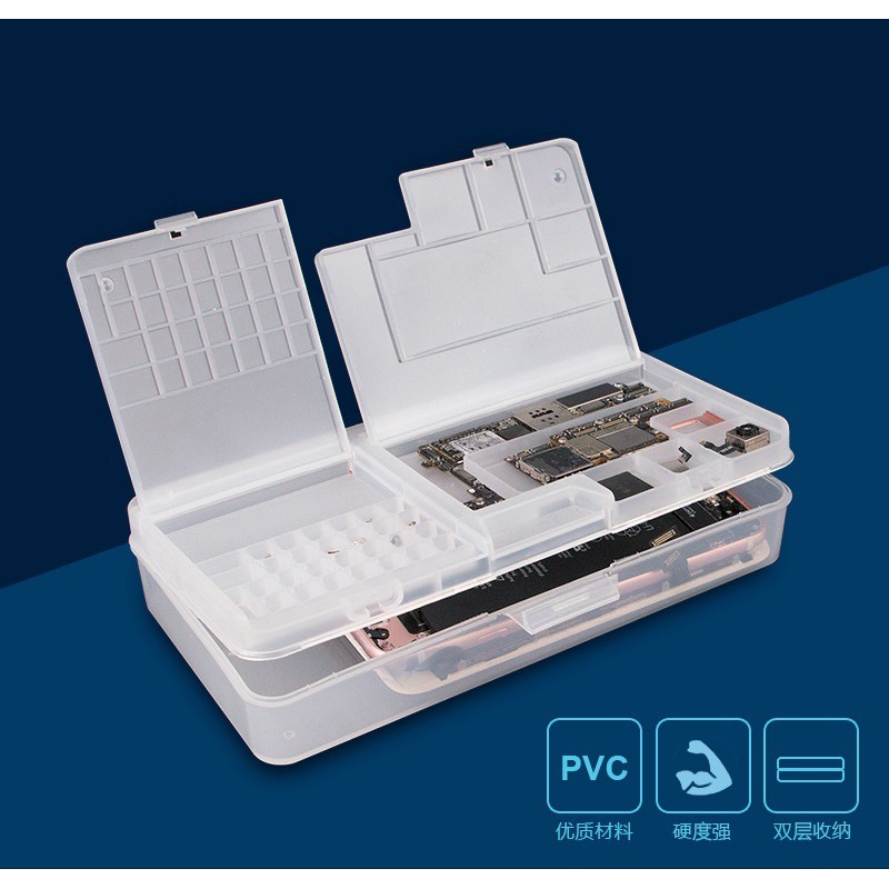 - Trên cùng có 2 ngăn . 1 ngăn đựng main, 1 ngăn đựng ốc và ic