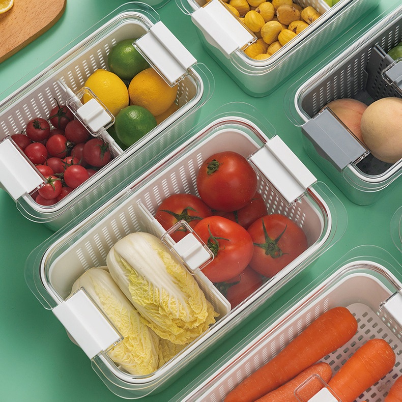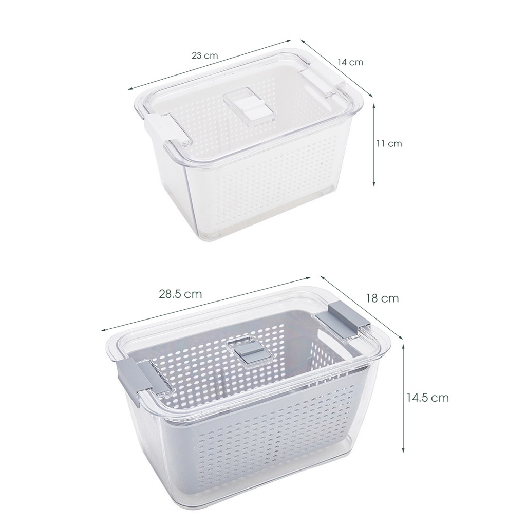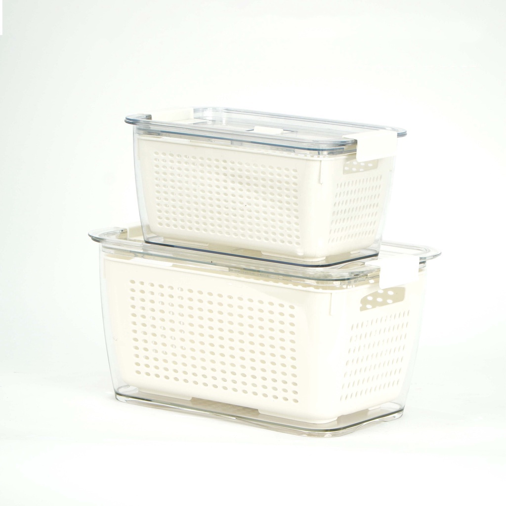 - Mỗi hộp được thiết kế với 2 lớp là rổ bên trong và hộp nhựa trong bao bên ngoài. Điều này cho phép bạn làm ướt các loại rau củ trước khi cất vào tủ để giữ được sự tươi ngon lâu hơn nhưng không lo thực phẩm bị tích nước dẫn tới hư thối bởi lẽ nước sẽ chảy qua khe của rổ bên trong và đọng lại vào lớp hộp bên dưới. Đồng thời, với phần nắp đậy được thiết kế khóa gài kiểu lock&lock ở 2 đầu, sản phẩm bên trong sẽ giữ được sự tươi ngon tối đa