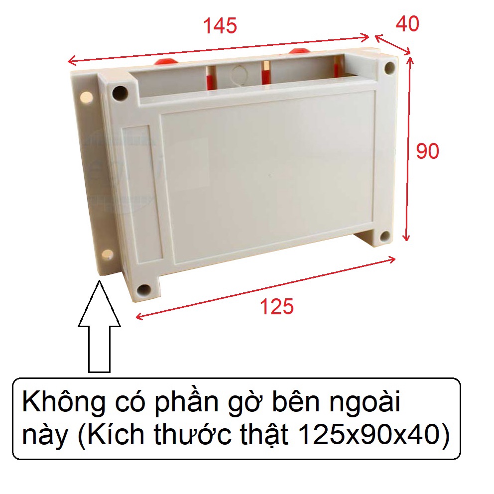 Hộp nhựa PLC trong suốt khổ tiêu chuẩn 145X90X40 (Kích thước thật 125x90x40) - Gắn ray nhômHộp nhựa này không có phần gờ 2 phía ngoài cùng, khổ tiêu chuẩn là 145x90x40, khi bỏ 2 phần gờ này kích thước thật của hộp là 125x90x40. Quý khách vui lòng xem hình ảnh mô tả phía trên để dễ hình dung về kích thước thật của sản phẩm.