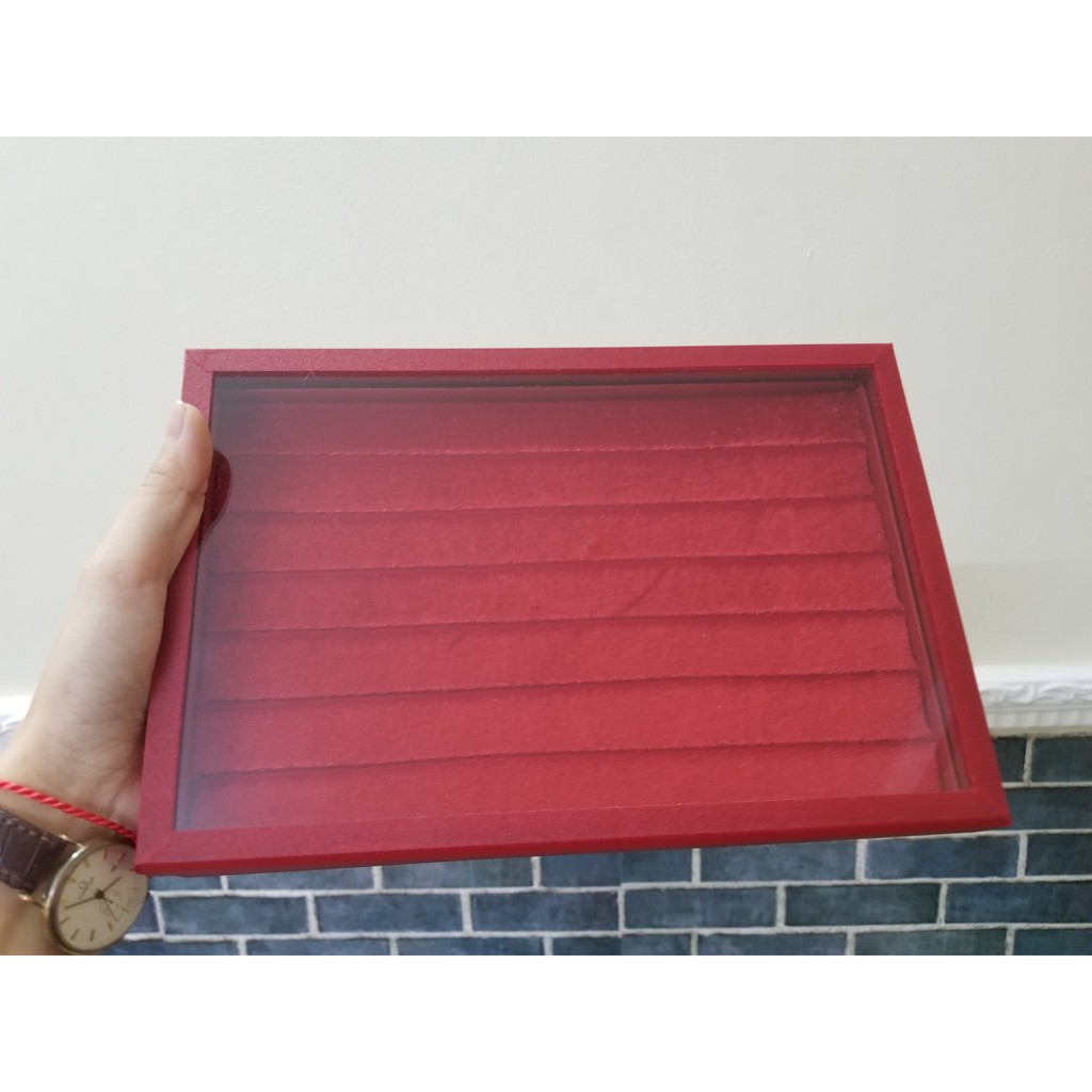 Hộp nhung trưng bày nhẫn nắp kính- Kích thước: dài 23,5cm, rộng 16cm, cao 4cm