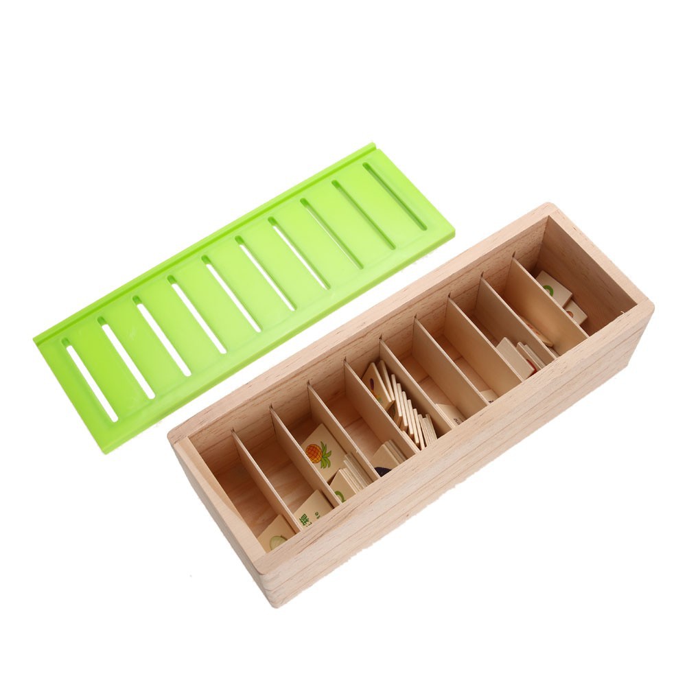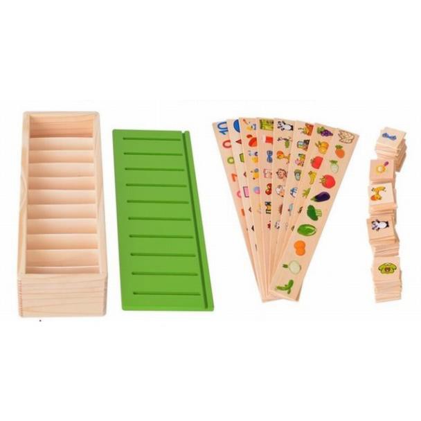 Kích thước: Hộp đựng 30cm x 10cm x 10cm. Kích thước các chi tiết vui lòng xem trên ảnh sản phẩm.Chất liệu: Hộp gỗ, các loại thẻ bằng gỗ, nắp hộp xanh làm bằng nhựa an toàn