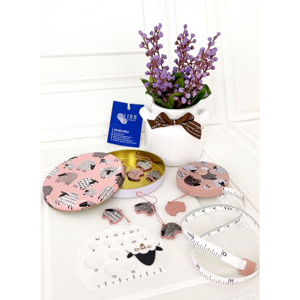 Hộp phụ kiện đan móc DMC Accessories Box U1968 bao gồm 1 thước dây đáng yêu màu hồng hoặc xám , chiều dài thước tối đa là 1.5m (150cm) . 1 hộp phụ kiện xinh xắn bằng kim loại bên trong gồm 5 kim đánh dấu đan móc và 1 thước đo size kim hình dáng chú cừu đáng yêuDMC Accessories Box U1968