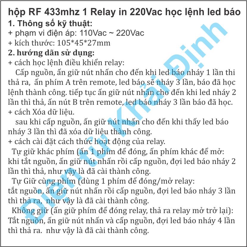 Thiết Bị Điện Gia Dụng > Mạch điện & Phụ tùng > Thiết bị báo động nhà ở || hộp RF 433mhz, 1 Relay, input 220Vac, học lệnh, led báo kde2118Còn hàng