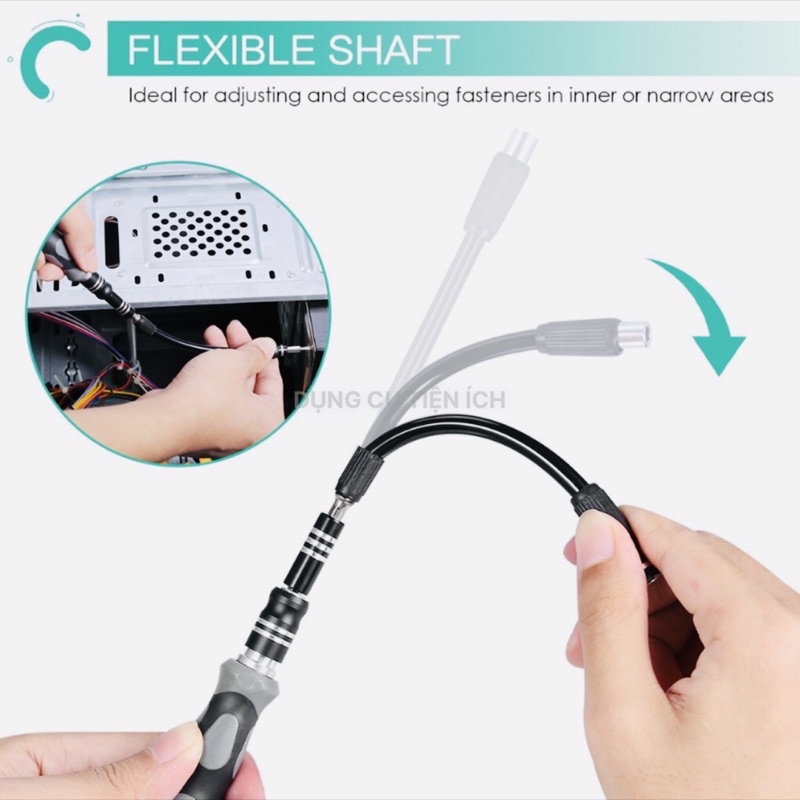 -Bộ tua vít này có một thanh nối dài có thể điều chỉnh và một trục linh hoạt dành cho các thiết bị điện tử có khích thước lớn mà ốc vít không nằm trên bề mặt.