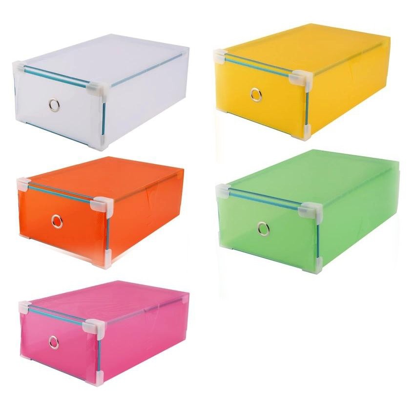 hông tin sản phẩmTên sản phầm:Hộp đựng giày trong suốt viền kim loạiXuất xứ: Trung QuốcKích thước phần hộp đựng giầy: 29,5cm x 17cm (sai số +-2cm)Màu sắc: Cam, Xanh, Hồng đóng thành combo màu ngẫu nhiên.Chất liệu: nhựa trong suốt viền khung kim loại chắc chắn không bị xô lệch, móp méo khi sử dụngCó thể gắn kết nhiều hộp với nhau thành 1 tủ giày vừa với diện tích mà bạn muốn cất giữ rất tiện lợi.Thiết kế phù hợp để đựng nhiều loại giày khác nhau giúp bảo quản giày trong điều kiện tốt nhất, sạch sẽ và không bị bám bụi bẩn.Hộp đựng giày nhỏ gọn có thể xếp lên kệ tủ giày hoặc xếp chồng dưới sàn nhà tùy theo diện tích nhà bạn