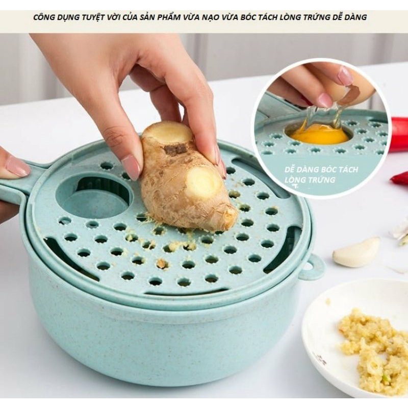 nạo ợi to, nhỏ, cắt miếng, cắt sóng, mài củ, lọc lòng đỏ trứng lại có rổ, chậu rửa đi kèm rất tiện lợi