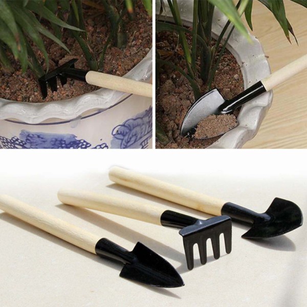 Bộ dụng cụ làm vườn mini 3 món bao gồm: 1 cây cào, 1 cây xẻng đầu tròn và 1 cây xẻng đầu nhọn.