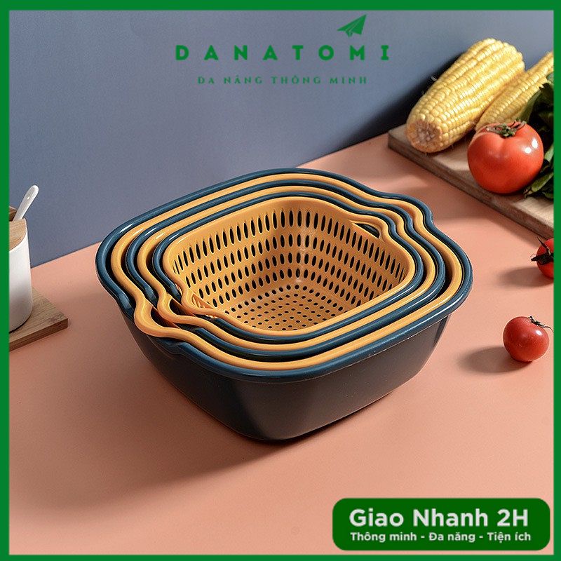 Kết hợp 2 loại rổ thành một đôi, một chiếc có công dụng để ráo, 1 chiếc để đựng nước, mang lại hiệu quả mỗi khi ngâm, rửa