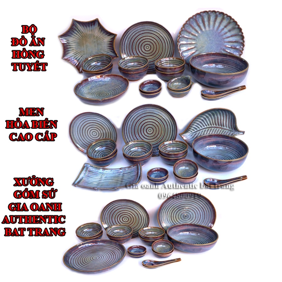 Tổng hợp bộ đồ ăn sang chảnh đẹp sang trọng – Bộ bát, đĩa Hồng Tuyết – Men Hỏa biến cao cấp – xưởng gốm sứ gia oanh authentic bat trang