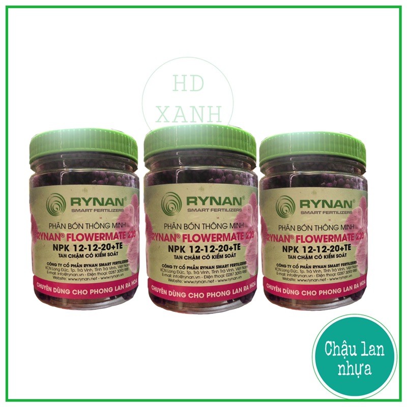 Phân tan chậm rynan 220 có tỉ lệ NPK 12-12-20, được sử dụng chuyên để đánh bật mầm ngủ của hoa, kích thích ra hoa tập trung và giúp hoa trổ đồng loạt. Với tỉ lệ Lân (P) và Kali (K) trong thành phần gần cân đối, hạn chế tối đa hiện tượng rụng hoa cho phong lan hiệu quả.