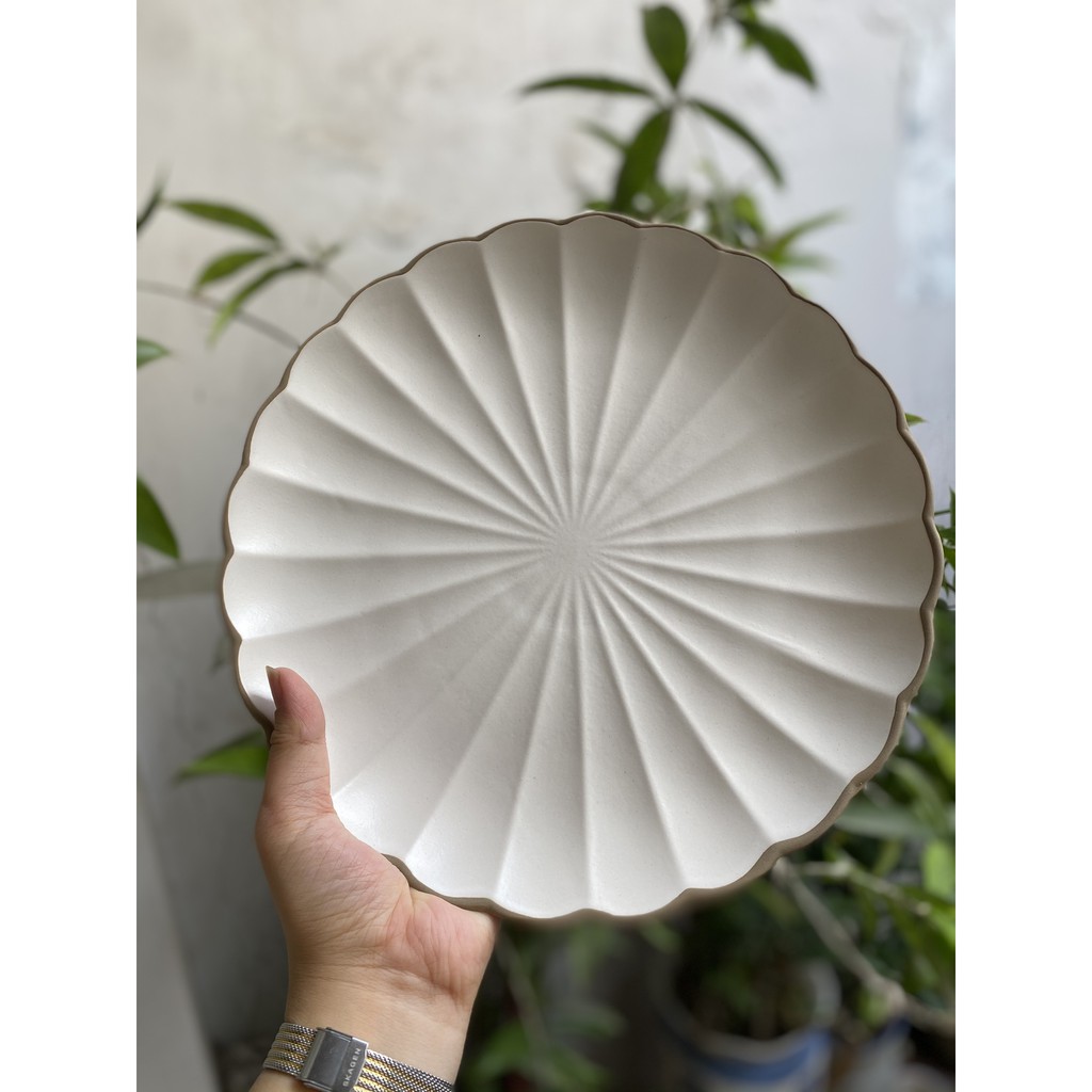 Đĩa sứ tròn được thiết kế theo phong cách Bắc Âu, tối giản mà tinh tế, trang nhã, tạo sự hài hòa trong trang trí nội thất hiện đại. Trên mặt đĩa có vân hình cánh hoa cúc xinh xắn, viền nâu được vẽ tay tỉ mỉ, tạo nên điểm nhấn độc đáo, bắt mắt.