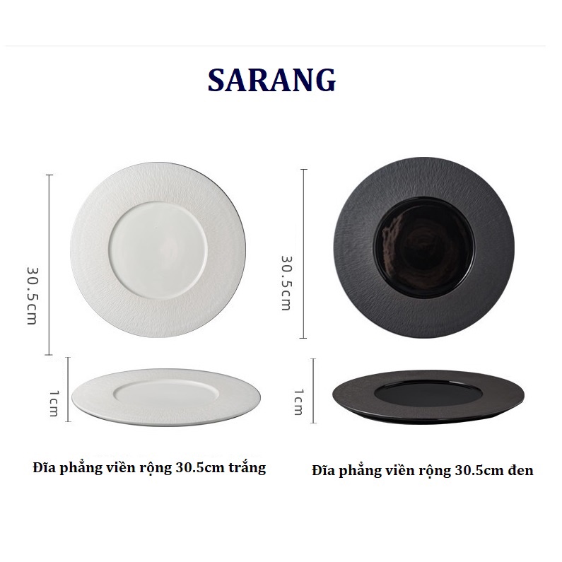 Nhà cửa & Đời sống > Bộ đồ bàn ăn > Dĩa || (HOT) Đĩa tròn phẳng viền rộng size đại 30cm Sarang 2 màu trắng/đen- Đĩa main nhà hàng, sứ cao cấp xuất khẩuCòn hàng