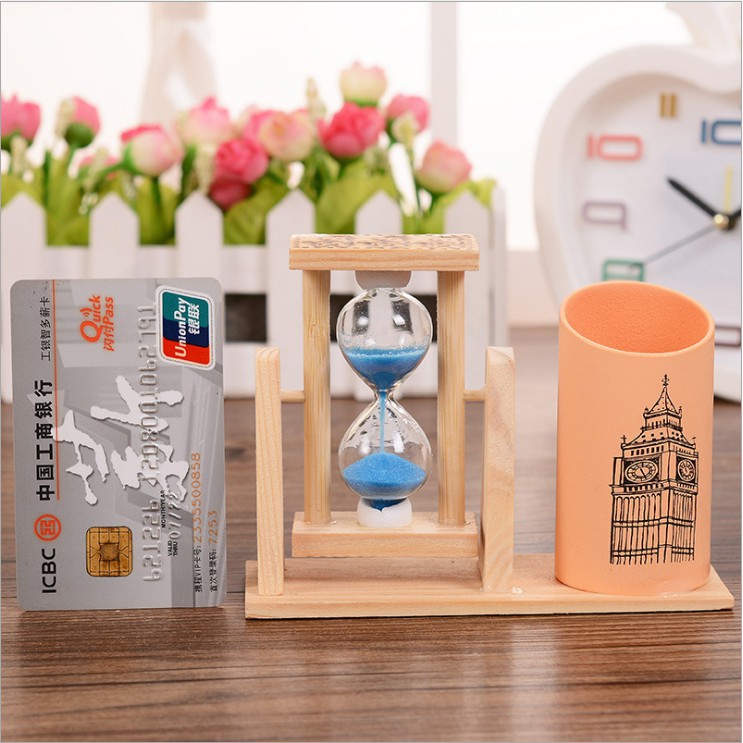 Đồng hồ cát kèm ống đựng bút GỖ 1 ngăn dạng tròn độc đáo- giao mẫu ngẫu nhiên
