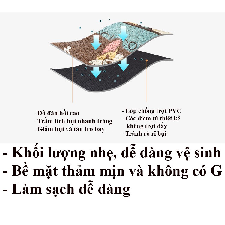 * Đặc biệt : Với lớp nhựa PVC mềm mại nhưng không xơ cưng khiến cho bề mạt thảm vô cùng chống thấm, khiến vệ sinh thảm cực kì dễ dàng và đơn giản chỉ với 1 vòi nước xịt vào.