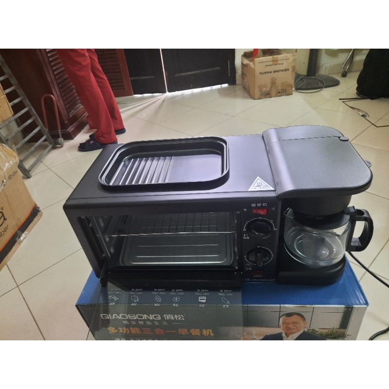 Sản phẩm là một chiếc máy tích hợp lò nướng, máy pha cà phê và bếp nướng.