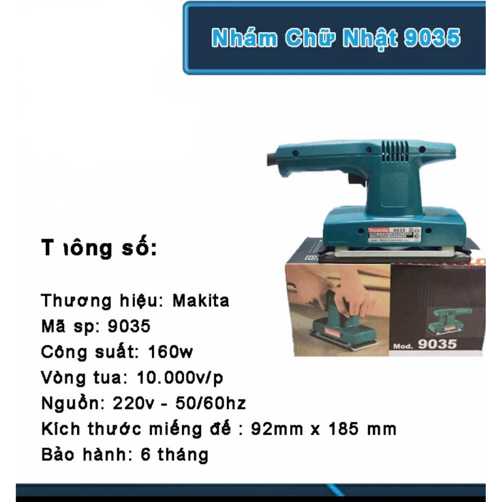 Máy chà nhám chữ nhật MAKITA 9035 đánh bật tối ưu các bề mặt nhám làm bóng mịn.Máy chà nhám chữ nhật MAKITA 9035 là một trong những thương hiệu máy chà nhám uy tín và tốt trên thị trường hiện nay. Người sử dụng tin dùng máy chà nhám của MAKITA với khả năng sử dụng dễ dàng. Đem lại hiệu suất làm việc cao.