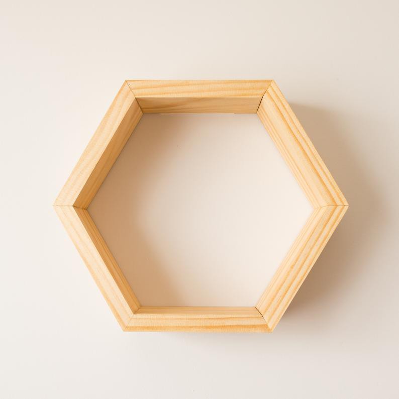 - Gồm 3 kệ gỗ hình lục giác bằng nhau, mỗi hình sở hữu diện tích cụ thể như sau : đường kính = ~30cm,