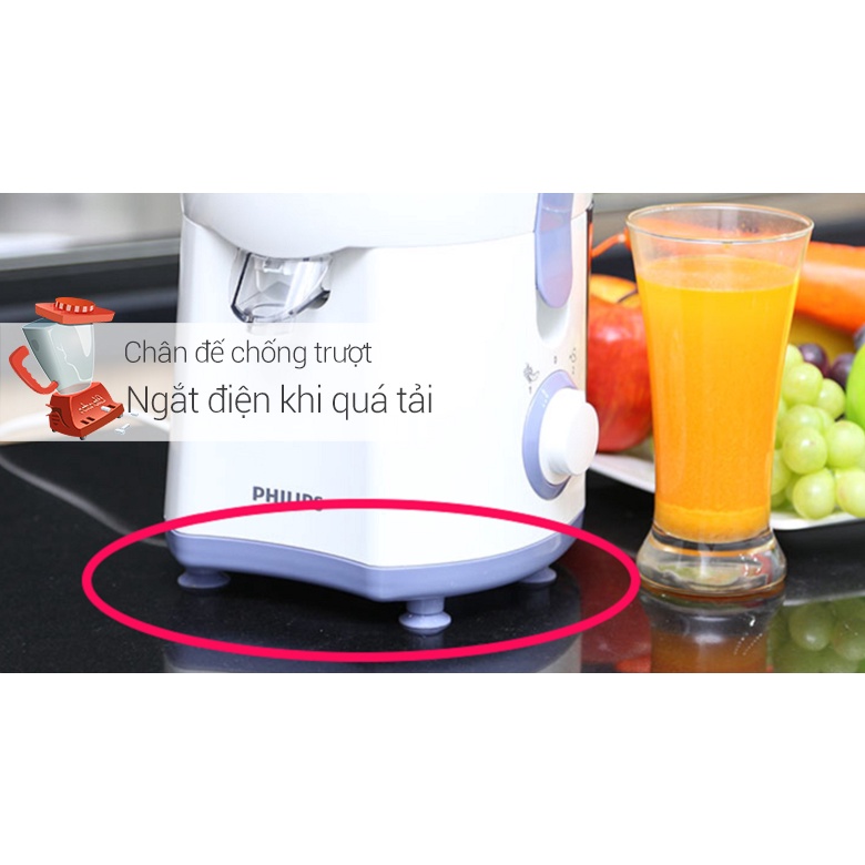 - Máy ép trái cây Philips HR1811 còn có chức năng tự ngắt điện khi hoạt động quá lâu giúp giảm nguy cơ hỏng động cơ và an toàn cho người sử dụng.