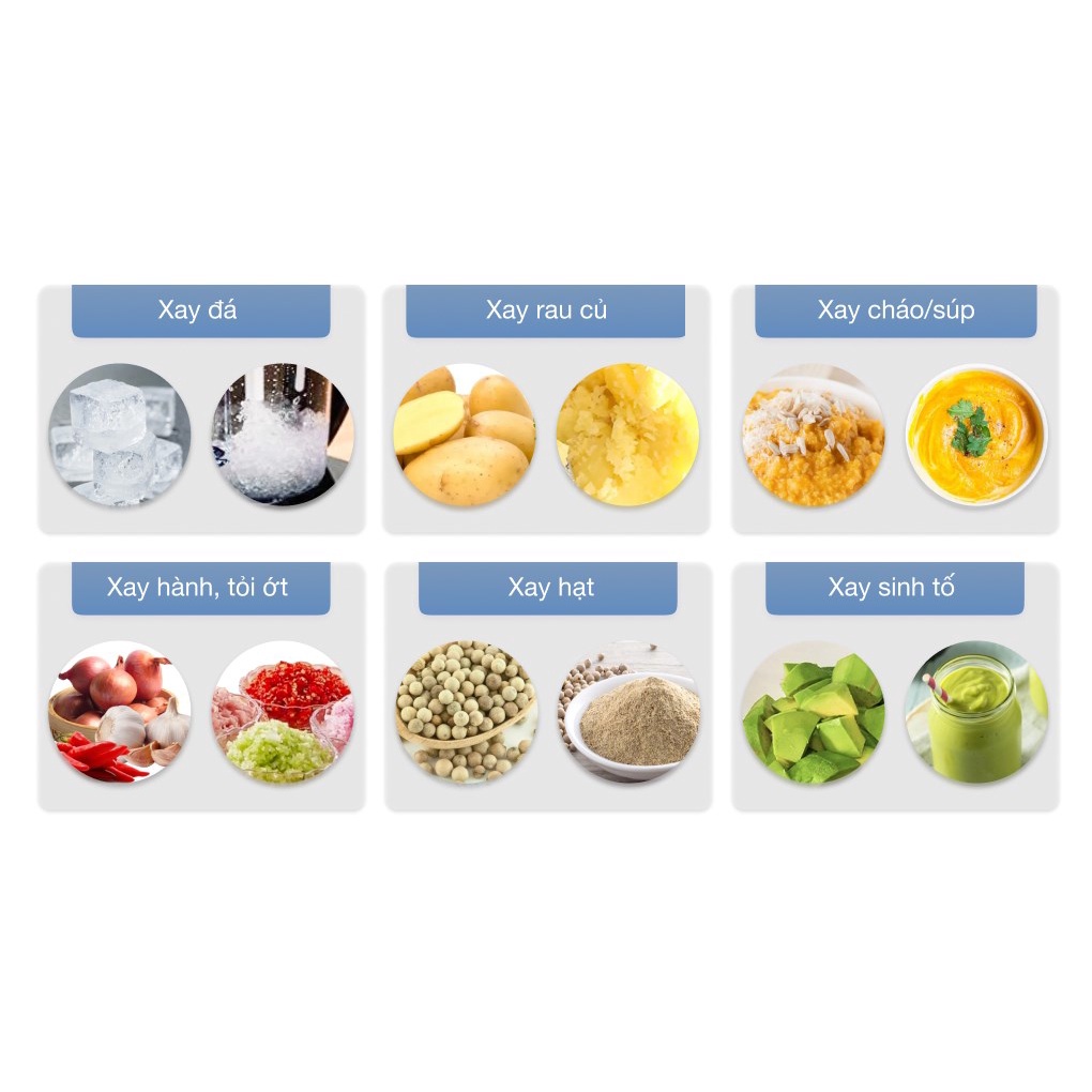 Chức năng chính: Xay cháo nguội. Xay cháo nóng. Xay gia vị: Hành, tỏi, ớt, nấm,...Xay hạt. Xay rau củ. Xay sinh tố. Xay súp. Xay được đá