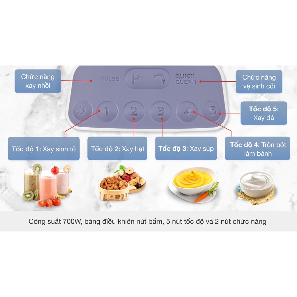 Chức năng chính: Xay cháo nguội. Xay cháo nóng. Xay gia vị: Hành, tỏi, ớt, nấm,...Xay hạt. Xay rau củ. Xay sinh tố. Xay súp. Xay được đá