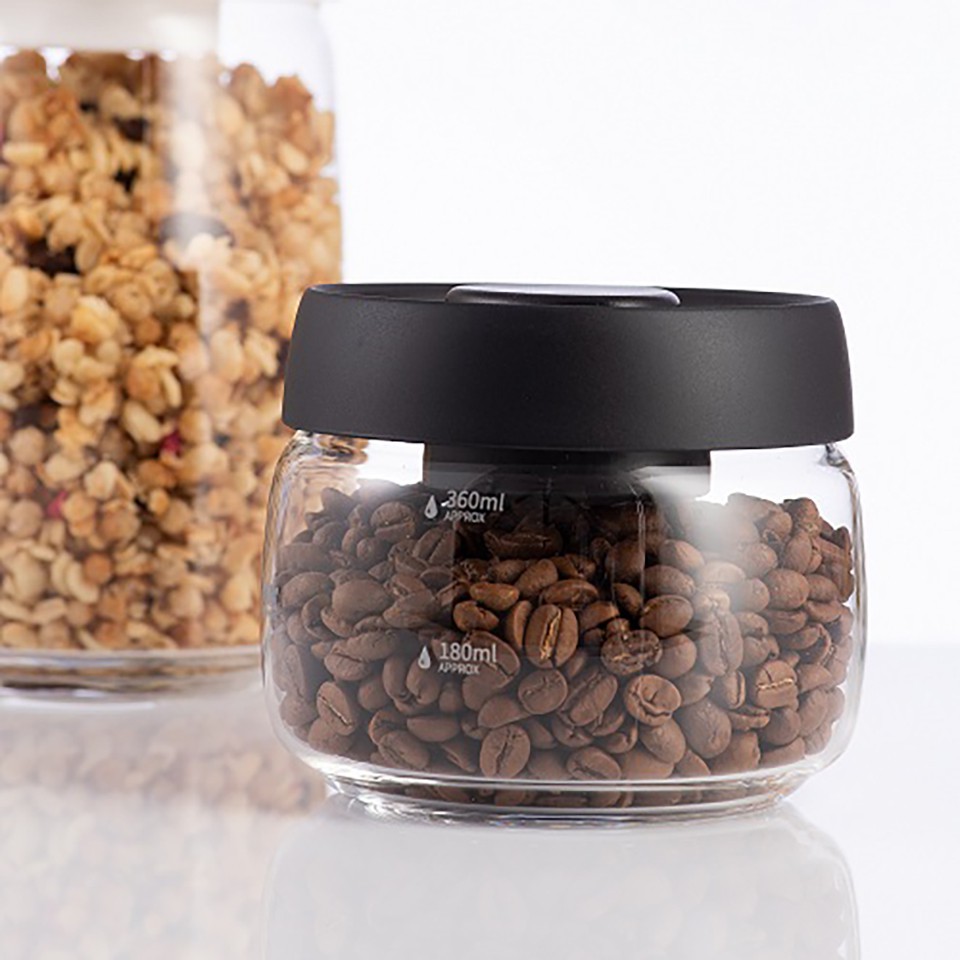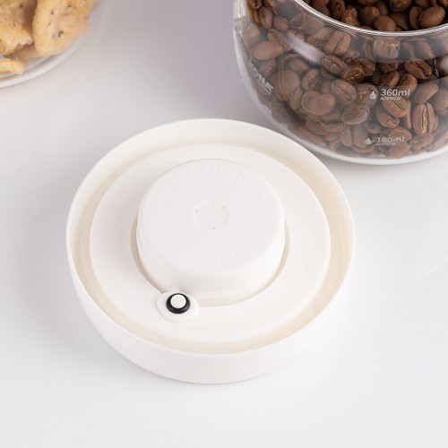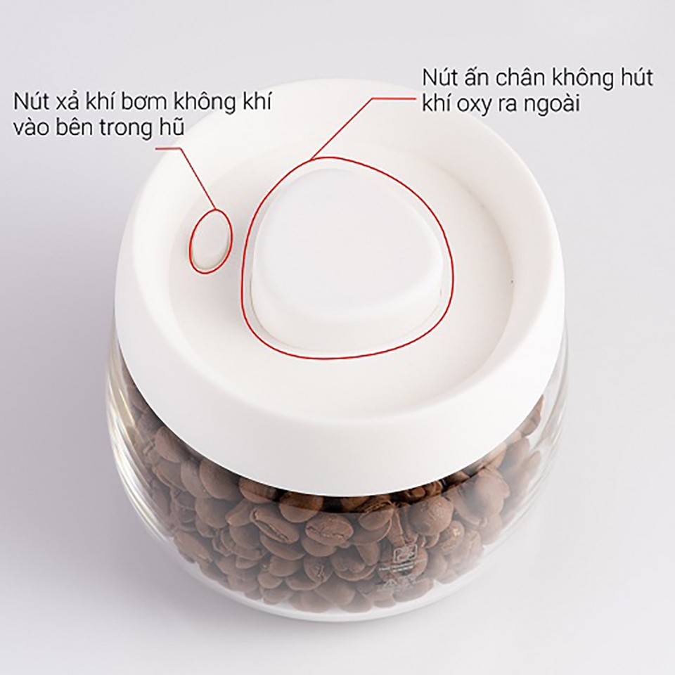 Hũ đựng cà phê thủy tinh tích hợp van hút chân không giúp bảo quản cà phê một cách tốt nhất. Hũ được làm từ thủy tinh chất lượng cao, độ bên và độ trong suốt cao giúp bạn có thể quan sát được rõ cà phê bên trong. Hũ có 2 nút bấm bên trên nắp. Nút lớn dùng để hút không khí bên trong ra ngoài, giúp tạo môi trường chân không, cà phê sẽ được đảm bảo được độ mùi vị và độ tươi, còn nút nhỏ dùng để xả khí bơm không khí vào bên trong.