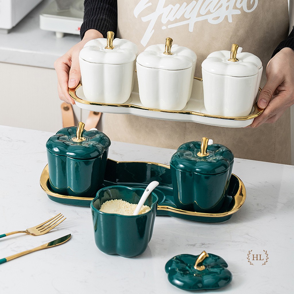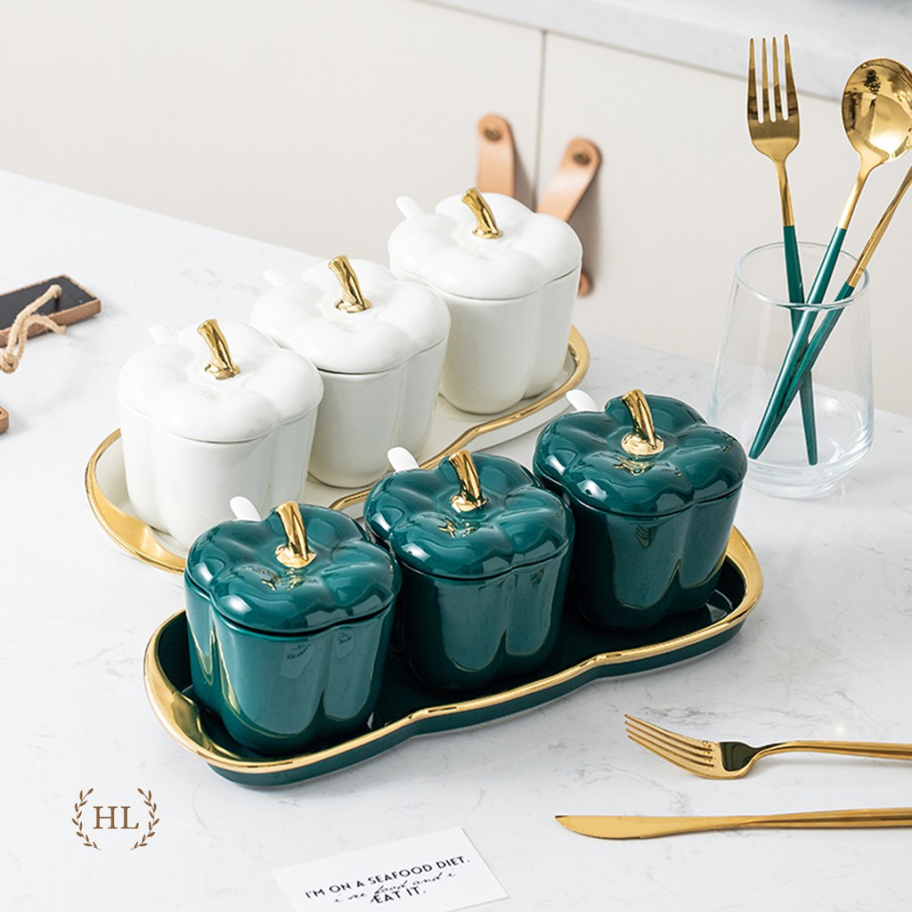 Giới thiệu HŨ ĐỰNG GIA VỊ BẰNG SỨ KIỂU DÁNG ỚT CHUÔNG PHONG CÁCH VINTAGE | BỘ GIA VỊ SỨ 3 KÈM ĐẾ SỨ CAO CẤP KẺ CHỈ VÀNG KIM DECOR