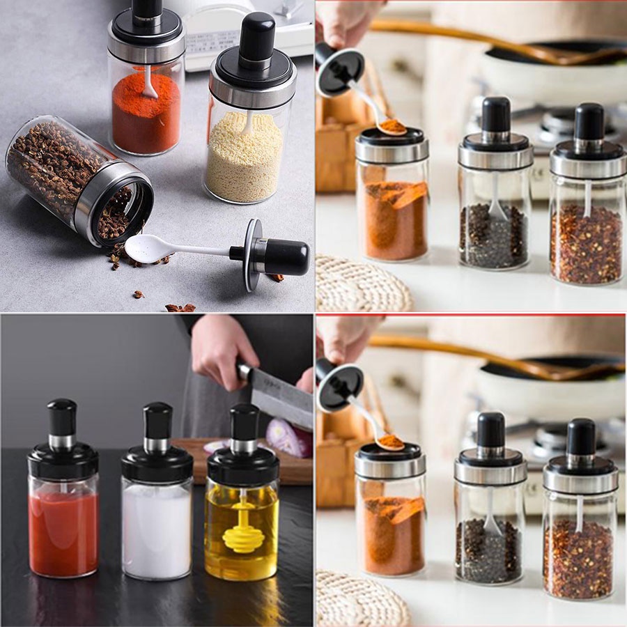 Hũ đựng gia vị có thìa thông minh - hộp gia vị thủy tinh kèm thìa.