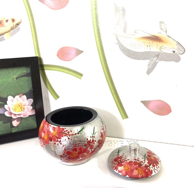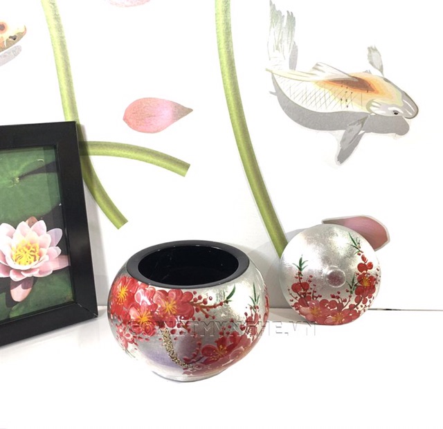 Giới thiệu Hũ Sơn Mài Tròn Φ11cm - Vẽ hoa đào đỏ & nền bạc
