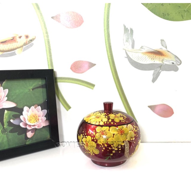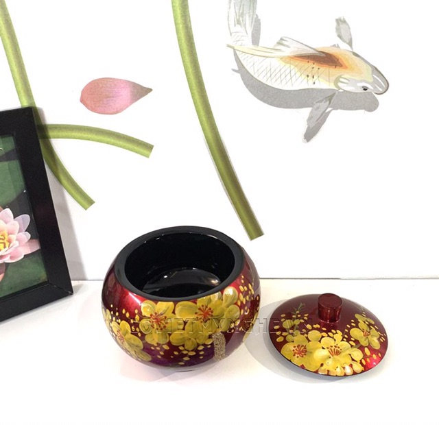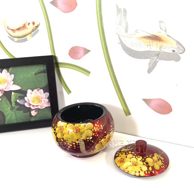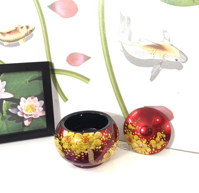 Giới thiệu Hũ Sơn Mài Tròn Φ11cm - Vẽ hoa mai vàng & nền đỏ