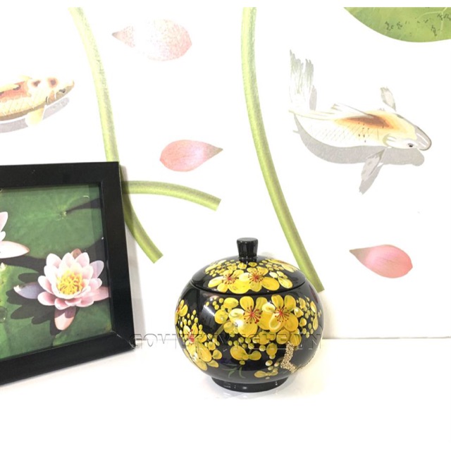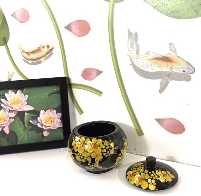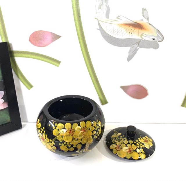 Giới thiệu Hũ Sơn Mài Tròn Φ11cm - Vẽ hoa mai vàng & nền đen