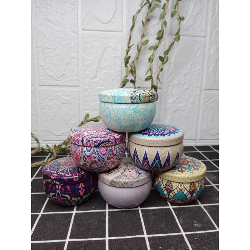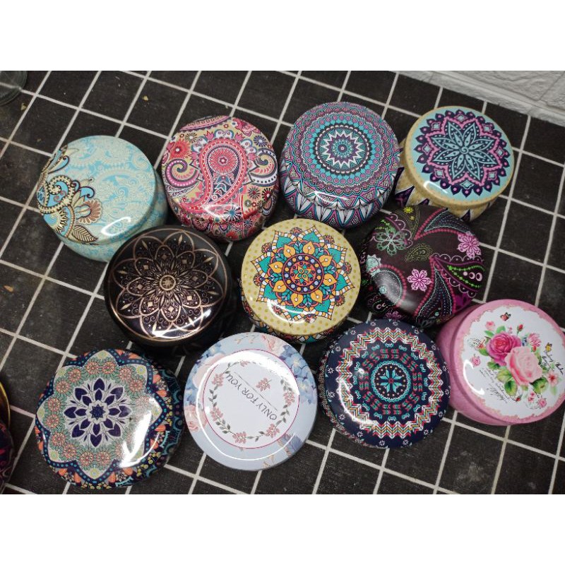 Hộp thiếc có nắp và trang trí hoạ tiết nhiều mẫu như hình, sơn bóng đẹp, đựng được 60-110g nến tùy theo size m có để phân loại cụ thểhộp chắc chắn, bền đẹp, dùng đựng vật nhỏ trang trí cũng cực xinh