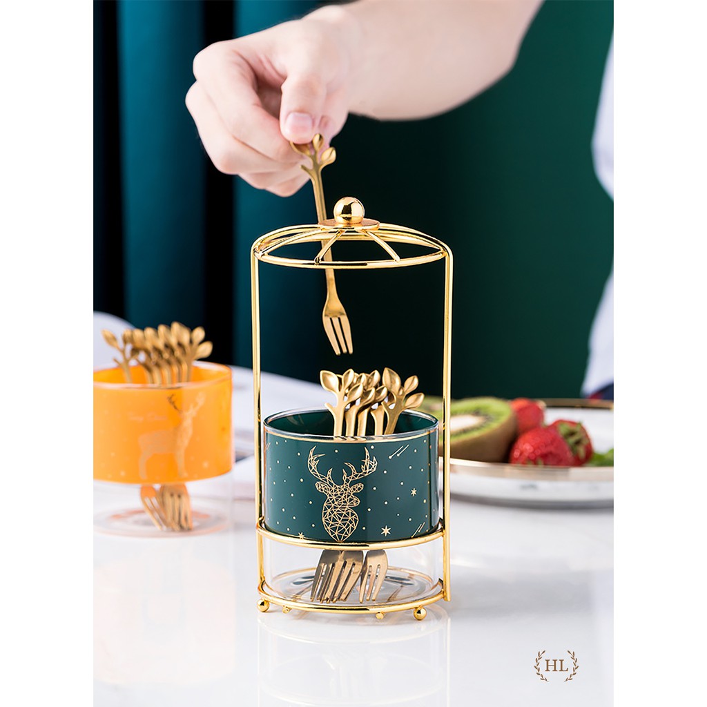 Chi tiết: Set bao gồm 1 hũ thủy tinh + 1 khung hợp kim mạ vàng + 6 Nĩa