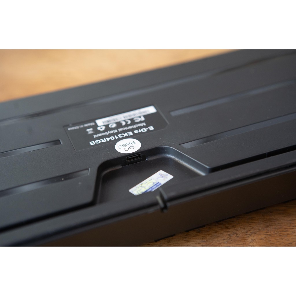 Trên thực tế, nếu bỏ thời gian khám phá chiếc phím cơ này thì chắc chắn nhiều người sẽ cảm thấy khá bất ngờ. Phần mạch phím được làm rất gọn và sạch , khu vực trung gian giữa switch và bảng mạch được lót thêm một tấm chắn kim loại phủ sơn chống gỉ có khoét lỗ thoát nước. Nhờ có thiết kế hoàn thiện như vậy nên EK3104 có khả năng chống lại các tai nạn vô ý. Bên cạnh đó, tấm chắn kim loại còn giúp EK3104 gia tăng trọng lượng đáng kể giúp phím khá đầm khi cầm trên tay.