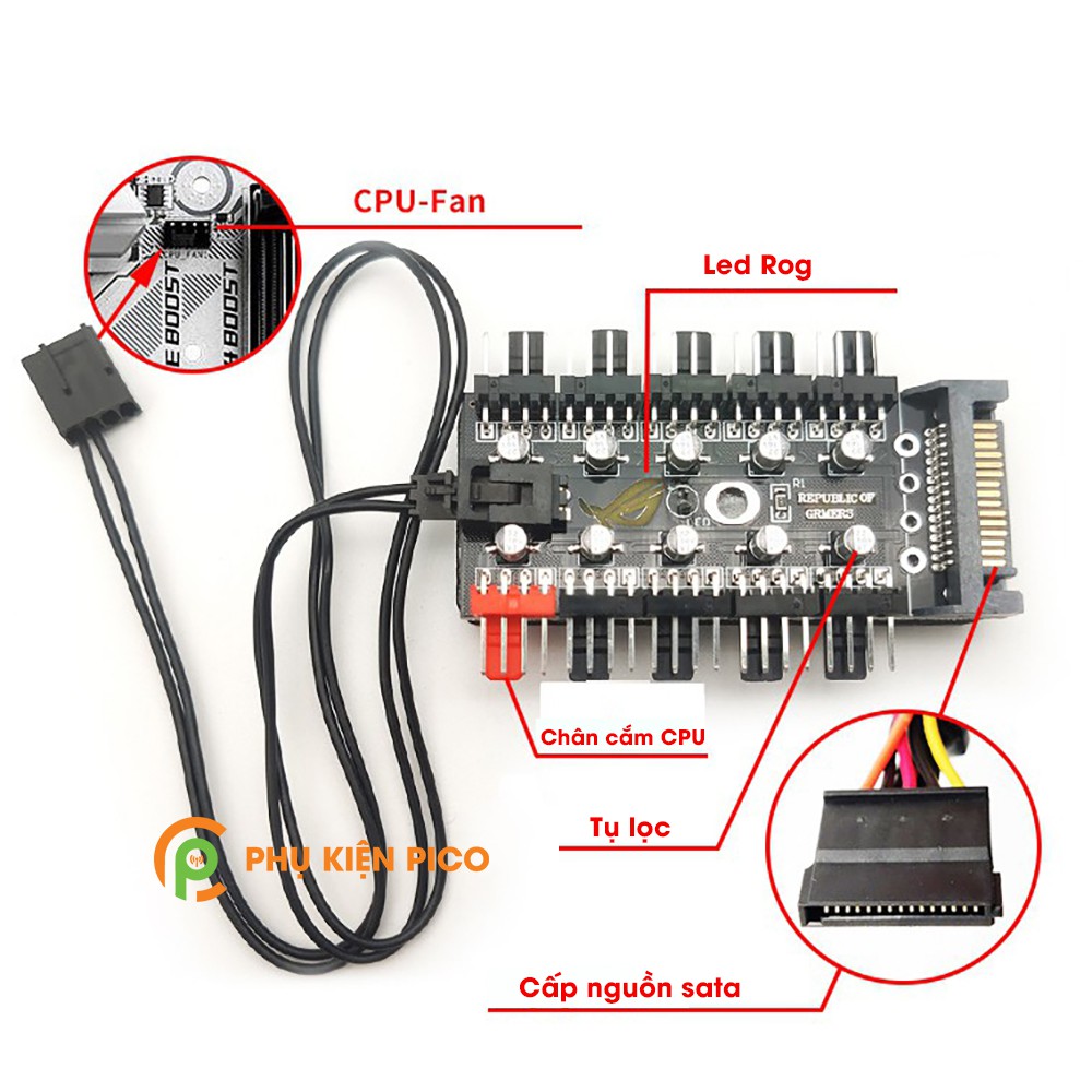 Bộ Hub 10 cổng chia Fan PWM 4 Pin hỗ trợ điều tốc, quạt tản nhiệt nguồn cấp điện cổng SATA, 10 tụ an toàn