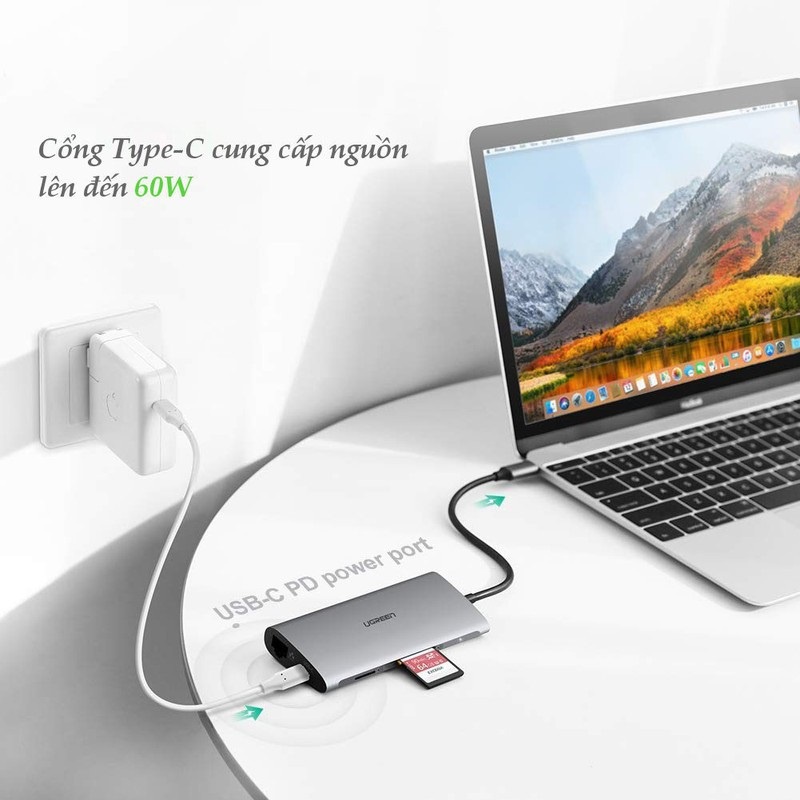 - Bộ Hub USB-C chuyển đổi đa năng Ugreen 50538 từ USB type C sang HDMI + USB 3.0 và Lan Gigabit 100/1000Mbps và hỗ trợ chức năng thẻ nhớ SD và có cổng sạc USB type-C cho máy tính của các bạn.