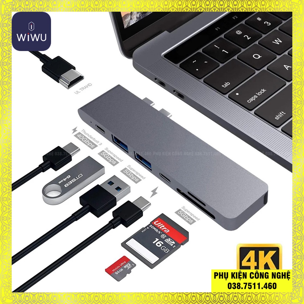 * WIWU 7-in-1 Multiport Hub với Đầu nối USB-C Kép dễ dàng bổ sung ba cổng USB 3.0 Loại A, một cổng đầu ra HD, một khe cắm thẻ nhớ TF, một khe cắm thẻ SD và một cổng Thunderbolt 3 USB 3.1 Kiểu C. Một giải pháp lý tưởng cho MacBook Pro 13,3 inch hoặc 15,4 inch của bạn với hai cổng Thunderbolt 3 (USB-C) khả dụng. Thiết bị nhỏ gọn, thời trang này không yêu cầu nguồn điện bên ngoài, vì vậy nó nằm gọn trong văn phòng. Bạn cũng có thể dễ dàng bỏ nó vào túi khi đi công tác.