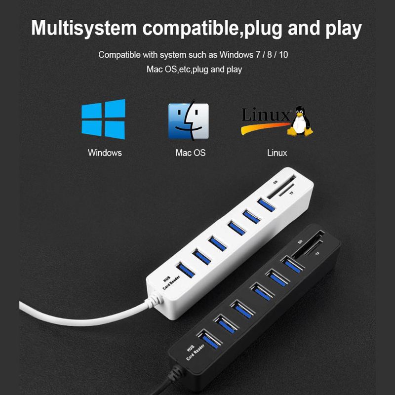 - Chia 1 cổng USB thành 6 cổng USB 2.0, thiết kế thông minh tích hợp thêm 1 đầu đọc thẻ SD, thẻ TF tiện lợi