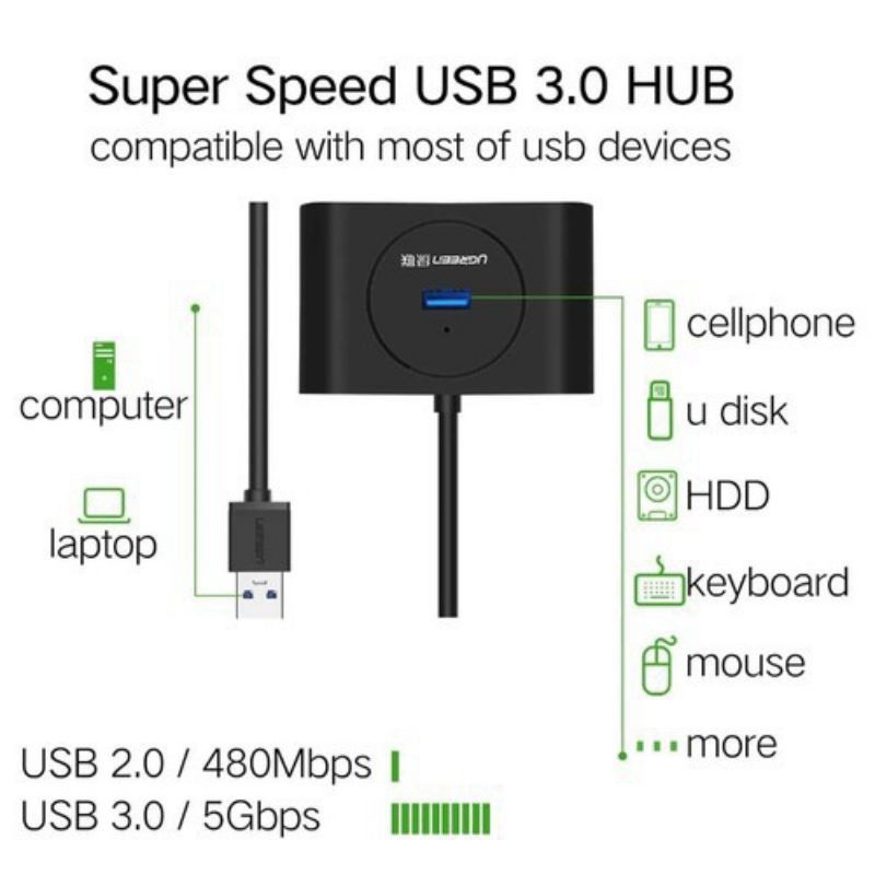+ Bộ chia USB 4 cổng Ugreen 20290 giúp bạn mở rộng thêm 4 cổng USB 3.0 với máy tính của bạn,