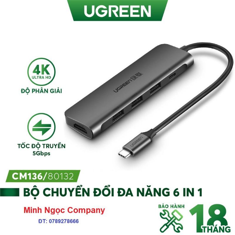 Máy tính & Laptop > Phụ Kiện Máy Tính > Bộ chia cổng USB & Đọc thẻ nhớ || HUB bộ chuyển đổi USB Type C 6 in 1 (sang HDMI+3 cổng USB 3.0+cổng 3.5mm+ cổng USB Type C) UGREEN 80132 CM136Còn hàng
