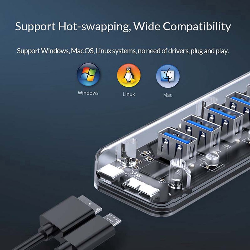 Bạn cũng có.thể tránh được những rắc rối của việc rút ra hoặc.cắm thiết bị USB của bạn vào máy tính, bởi.vì nó có đến 7cổng USB 3.0 ngay bên cạnh.bạn. Hoàn toàn Plug & Play, không cần.cài Driver và tương thích với tất cả hệ điều.hành Windows XP, Vista, 7, 8, Mac OS 9.1 hoặc.mới hơn.