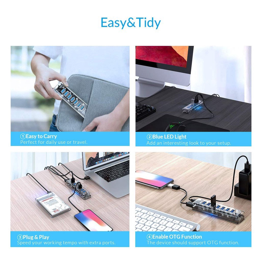 Giới thiệu Hub chia 7 cổng USB 3.0 Orico F4U-U3 / F7U-U3-CR TRANSPARENT Tốc độ truyền 5Gbp Loại trong suốt