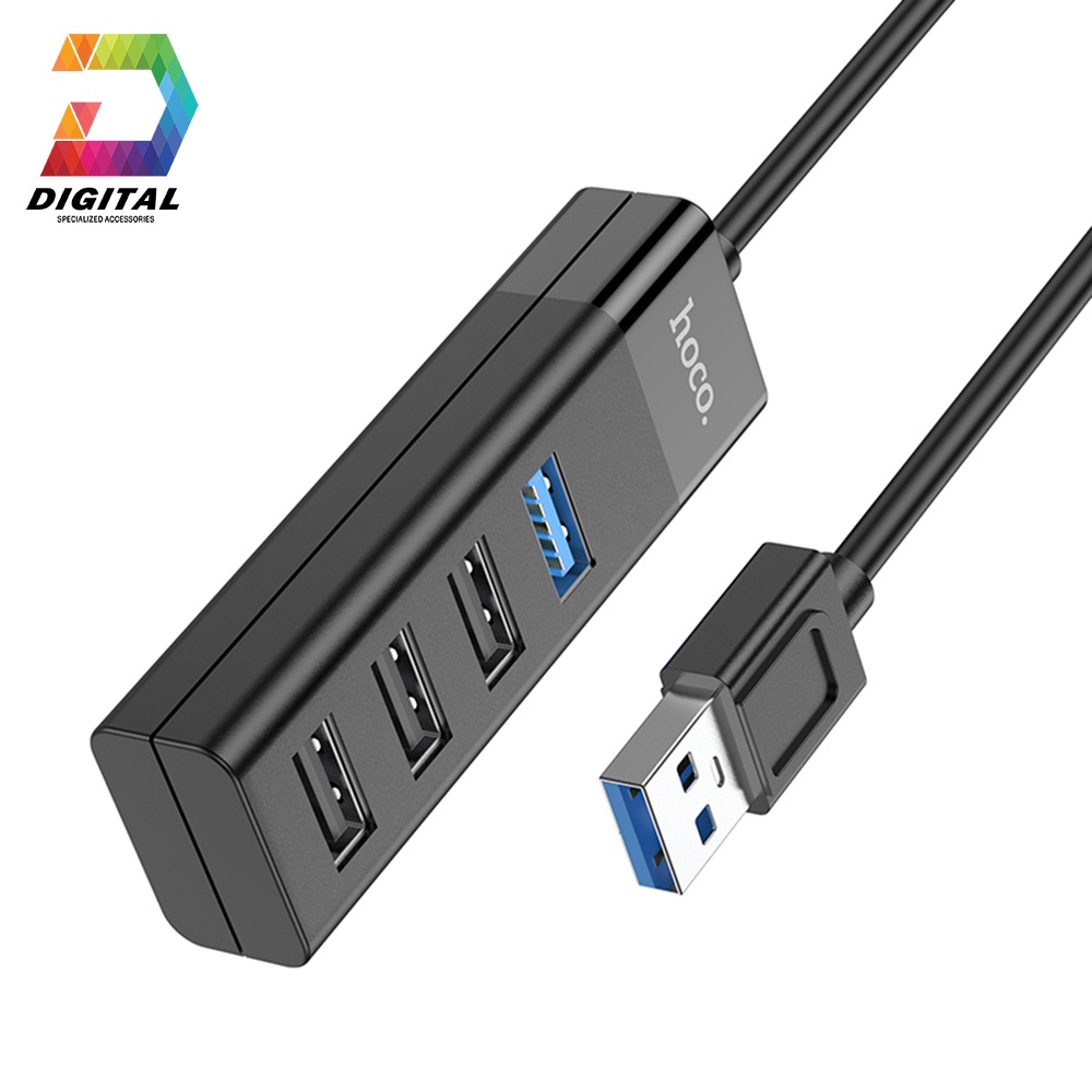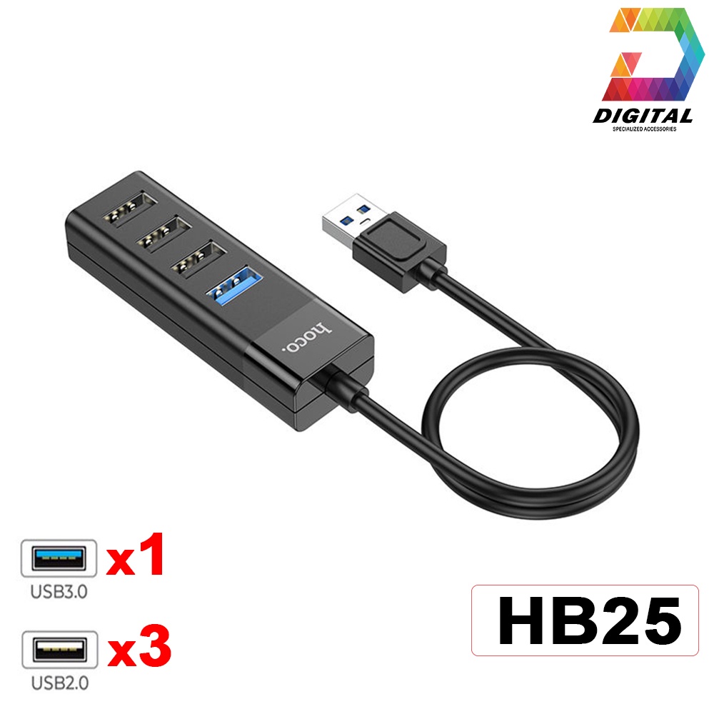 - Hub USB Hoco HB25 với 3 cổng USB 2.0, 1 cổng USB 3.0 và một đầu USB để kết nối với cổng USB trên máy tính.