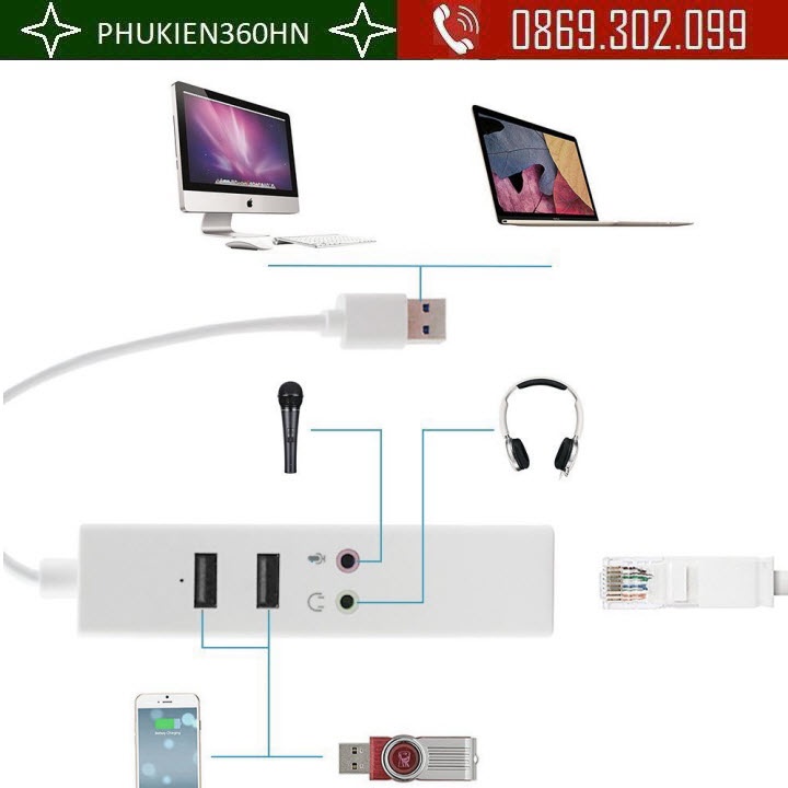 HUB chia USB có SoundCard và Cổng Mạng mở rộng RJ45