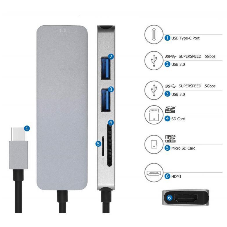 Kết nối đầu vào: USB type-C Kết nối đầu ra: 1x HDMI ; 2x USB 3.0 ; 1x đọc thẻ SD ; 1x đọc thẻ TF. Bộ mở rộng cổng USB type-C sang HDMI và Hub USB 3.0 được thiết kế để kết nối MacBook có cổng USB-C với màn hình hiển thị có cổng HDMI với độ phân giải lên đến Full HD 4K/1080p Các cổng USB 3.0 tiêu chuẩn cho phép bạn kết nối các thiết bị như ổ đĩa flash của bạn hoặc máy ảnh hoặc USB để đồng bộ và truyền tải dữ liệu , phim ảnh , ca nhạc ... Tốc độ truyền tải của cổng USB 3.0 lên đến 5Gbps ( gấp 10 lần so với cổng USB 2.0) Kích thước : 20,8cm * 3,2cm * 1cmGiới thiệu sản phẩm USB-C / M sang HDMI / USB3.0A / F + SD / F + T / F là cáp mở rộng truyền video, thiết bị đầu vào có giao diện USB-C cho điện thoại di động, máy tính bảng, máy tính xách tay, , USB- Kích thước giao diện C nhỏ, hỗ trợ chèn tiến và lùi, truyền dữ liệu, đầu ra HDMI hỗ trợ độ phân giải cao 3840X2160P / 30HZ, màn hình HD của thiết bị đầu ra, TV LCD,