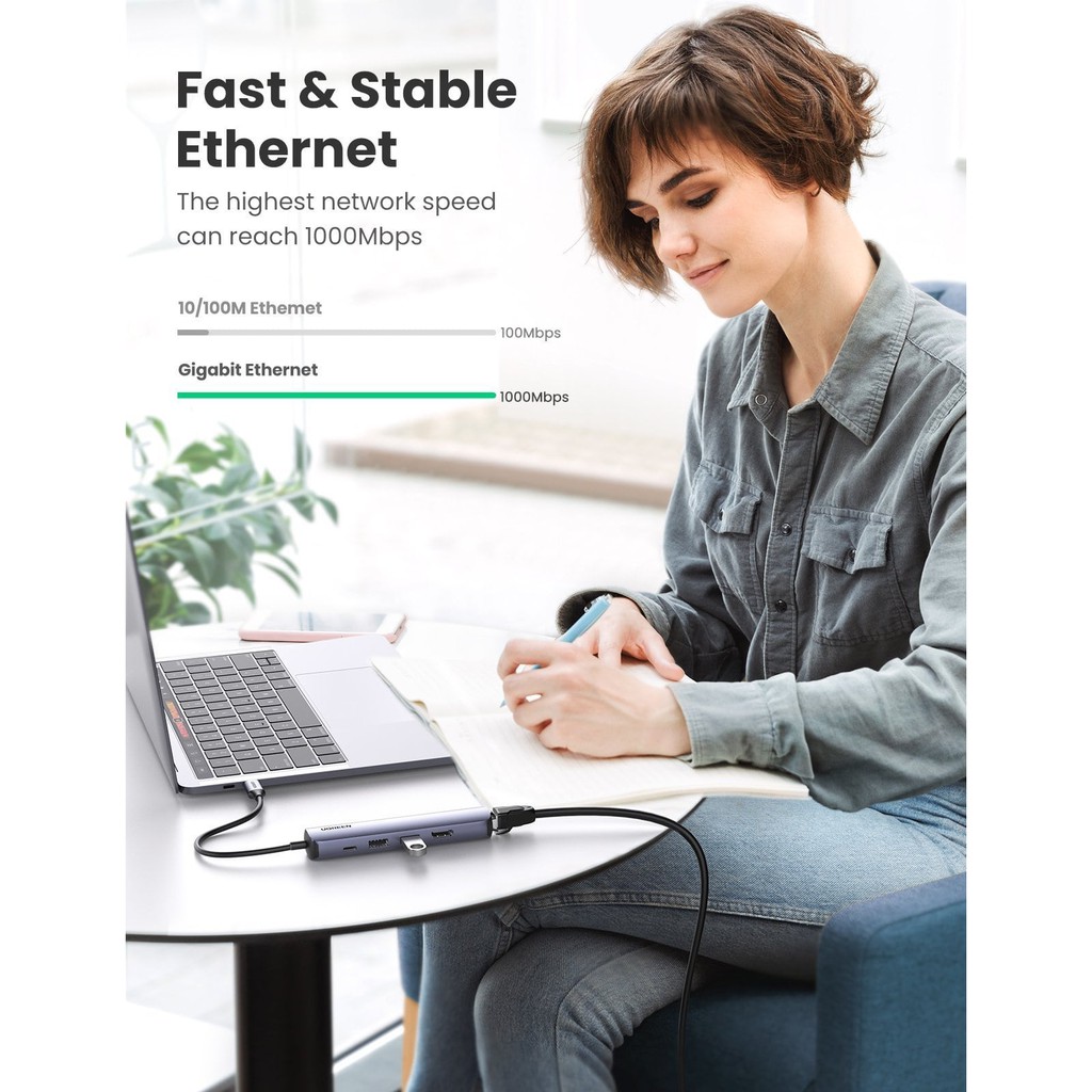 Cổng Chuyển chính hãng USB-C Sang HDMI + USB 3.0*2 + RJ45 + PD Ultra Slim Hub Ugreen 10919 giúp bạn trải nghiệm tốc độ truyền tải nhanh đến 1000Mbps. Đầu ra HDMI giúp hình ảnh hiển thị sắc nét, độ phân giải cao lên đến 3840 x 2160 @30Hz.Các Gigabit Ethernet có dây chắc chắn có thể đảm bảo kết nối ổn định và tốc độ tối đa lên đến 1000Mbps.